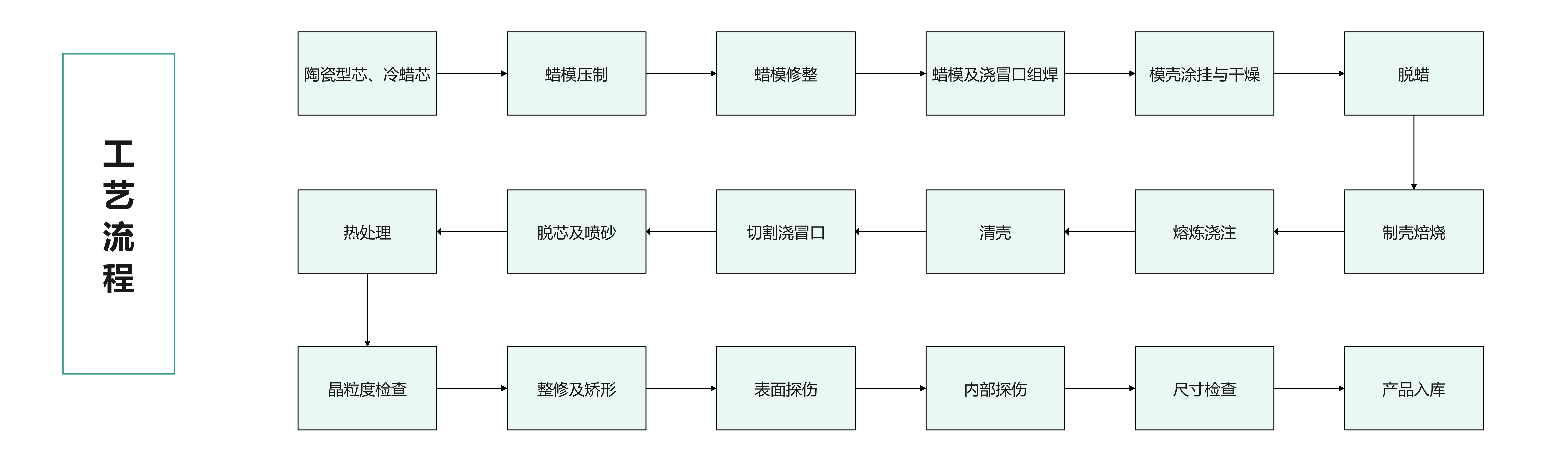 • 依托核心设备构建闭环生产体系,具备蜡模制备、型壳制造、熔炼浇注、脱壳脱芯、后处理、成品检测六大核心能力,可实现从合金原材料到成品铸件的全流程可控,精准匹配航空发动机叶片、航天推进系统关键部件等精密铸件的严苛生产需求